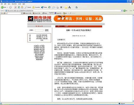 新华网浙江频道7月2日17点37分刊出的文章,将“都市快报”唐泽文的报道以“相关报道”的形式附在后面。新华社的文章一刊出,许多地方媒体立即转载。然而在当晚23点多再看新华网时,发现附后的唐泽文的文章已被删掉。而一些较早转载新华网文章的中国其他媒体,如“玉林日报”等则保留了新华网文章的最初样貌,见以下相关链接。 http://www.ylrb.com.cn/news/20030703/gnxw/102729.htm。
